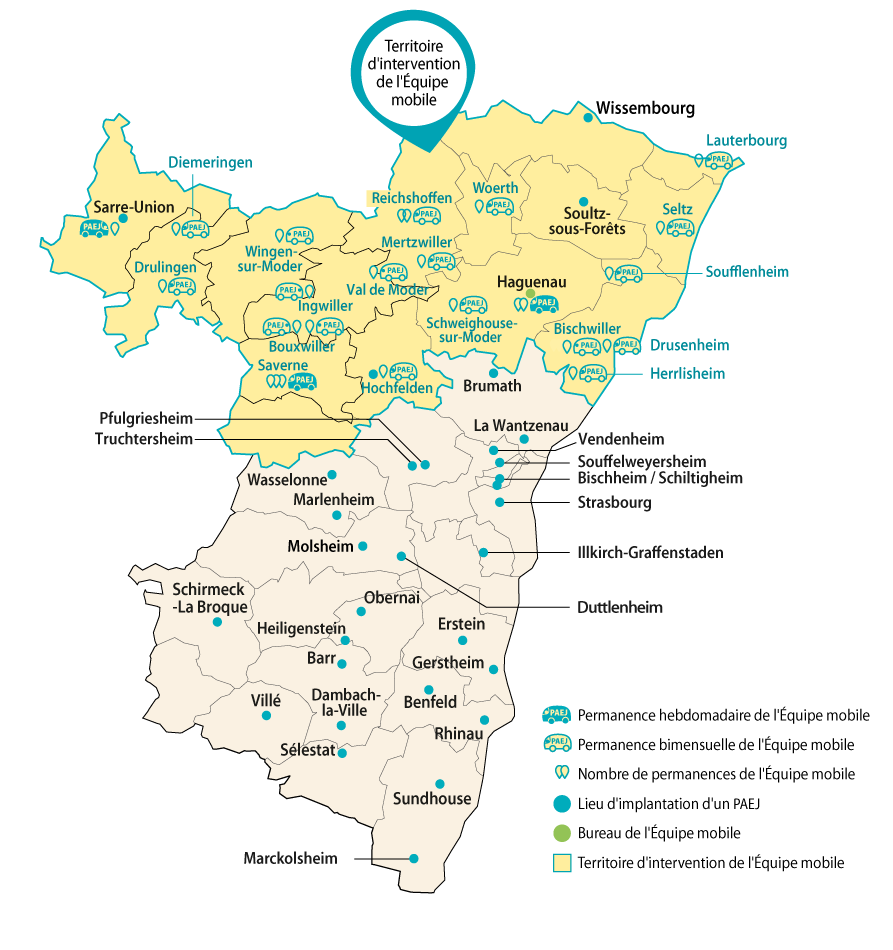 Le réseau des Points d’accueil et d’écoute pour les jeunes (PAEJ) du Bas-Rhin propose un accueil et une écoute anonymes. L’accès à ce service est gratuit. Dans le nord du Bas-Rhin l’équipe mobile intervient à la demande d’un ou d’une jeune, de parents ou de professionnel.le.s